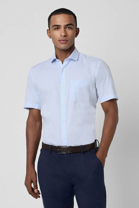 - Blue solid opaque Formal shirt ,has a spread collar, button placket, short regular sleeves, curved hem